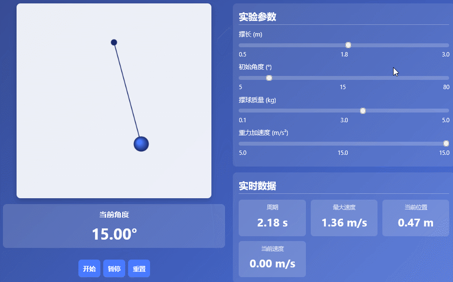 参数调节:摆长:0.5m 到 3.0m;初始角度:5° 到 80°;重力加速度:5m/s² 到 15m/s²;摆球质量 :0.1到0.5